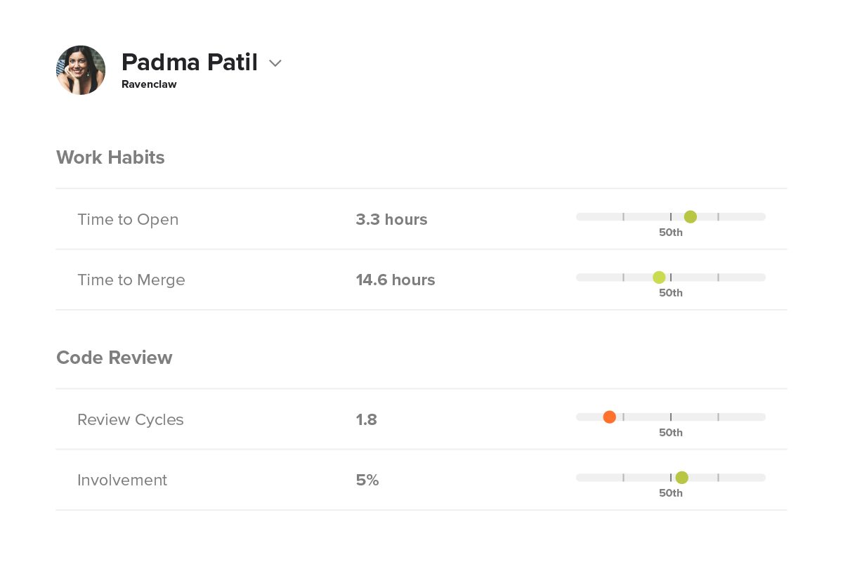 Distinguish one-off problems from trends by looking at how individual contributors perform on Velocity metrics over time. Compare their progress to industry standards or to the teamwide baseline.